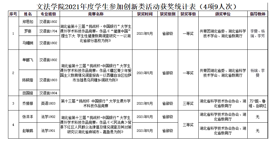 2021年度学生参加创新类活动获奖(部分)