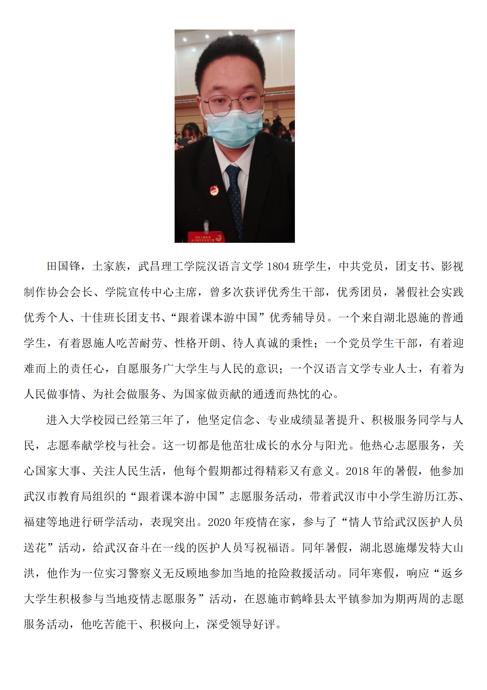 进入大学校园以来,他坚定信念、专业成绩显著提升、积极服务同学与人民,志愿奉献学校与社会。这一切都是他茁壮成长的水分与阳光。他热心志愿服务,关心国家大事、关注人民生活,他每个假期都过得精彩又有意义。2018年的暑假,他参加武汉市教育局组织的“跟着课本游中国”志愿服务活动,带着武汉市中小学生游历江苏、福建等地进行研学活动,表现突出。2020年疫情在家,参与了“情人节给武汉医护人员送花”活动,给武汉奋斗在一线的医护人员写祝福语。同年暑假,湖北恩施爆发特大山洪,他作为一位实习警察义无反顾地参加当地的抢险救援活动。同年寒假,响应“返乡大学生积极参与当地疫情志愿服务”活动,在恩施市鹤峰县太平镇参加为期两周的志愿服务活动,他吃苦能干、积极向上,深受领导好评。