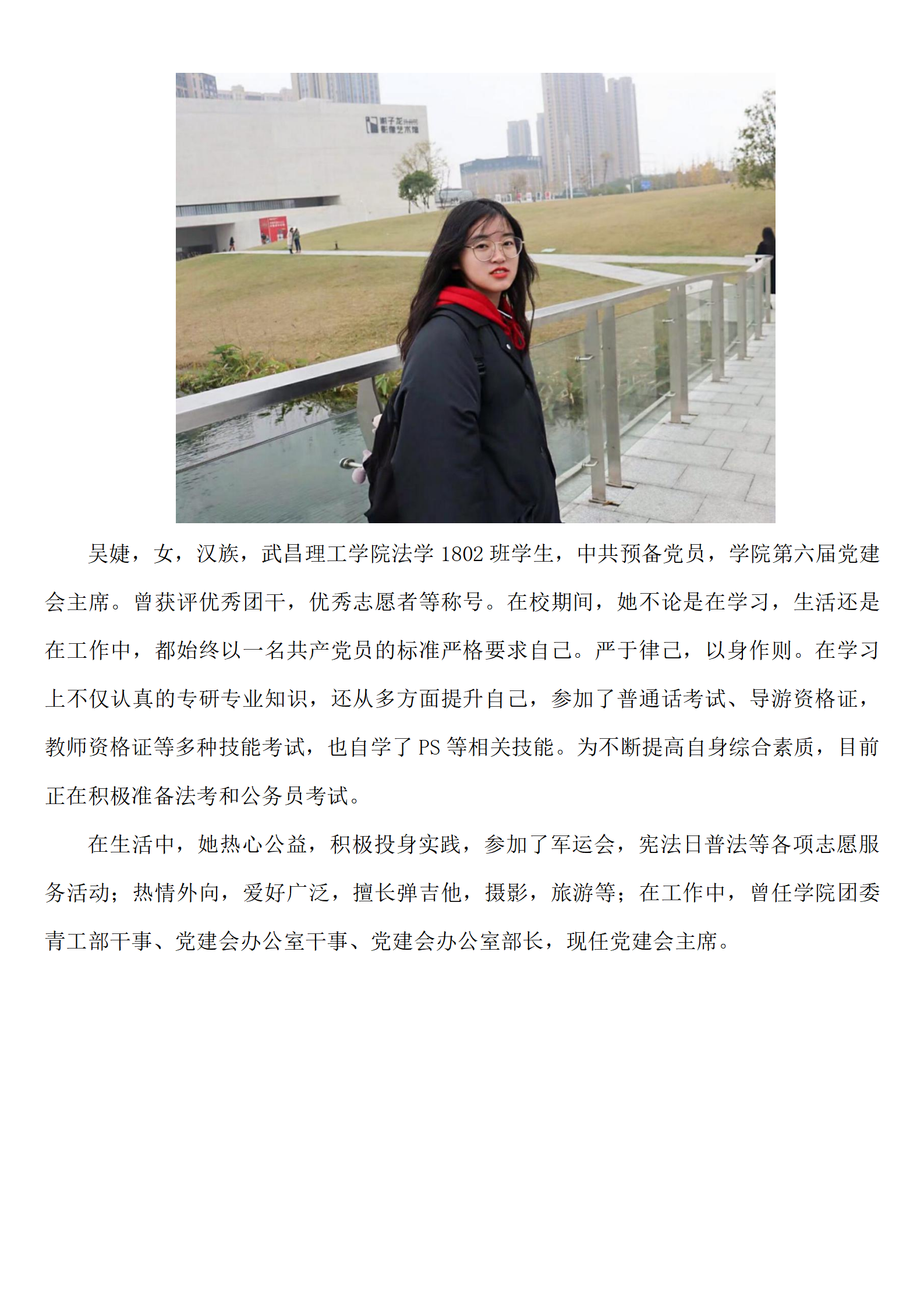 吴婕,女,汉族,中国·yL23411永利法学1802班学生,中共预备党员,学院第六届党建会主席。曾获评优秀团干,优秀志愿者等称号。在校期间,她不论是在学习,生活还是在工作中,都始终以一名共产党员的标准严格要求自己。严于律己,以身作则。在学习上不仅认真钻研专业知识,还从多方面提升自己,参加了普通话考试、导游资格证,教师资格证等技能考试。为不断提高自身综合素质,目前正在积极准备法考和公务员考试。在生活中,她热心公益,积极投身实践,参加了军运会,宪法日普法等各项志愿服务活动;热情外向,爱好广泛,擅长弹吉他,摄影等;在工作中,曾任学院团委青工部干事、党建会办公室干事、党建会办公室部长,现任党建会主席。