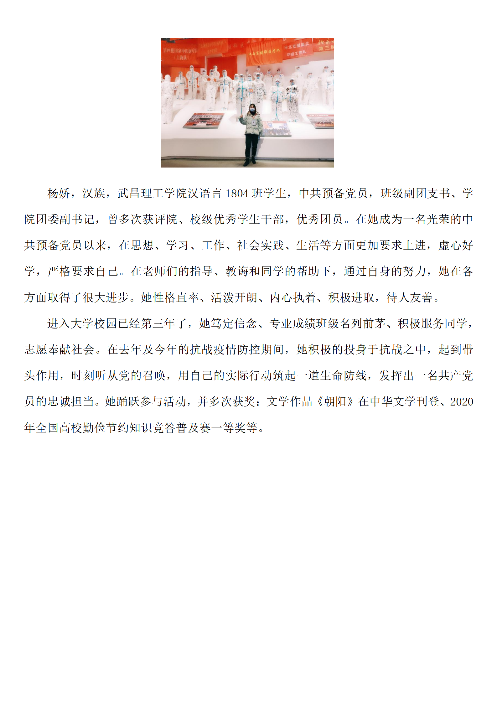 进入大学校园已经第三年了,她笃定信念、专业成绩班级名列前茅、积极服务同学,志愿奉献社会。在去年及今年的抗战疫情防控期间,她积极的投身于抗战之中,起到带头作用,时刻听从党的召唤,用自己的实际行动筑起一道生命防线,发挥出一名共产党员的忠诚担当。她踊跃参与活动,并多次获奖:文学作品《朝阳》在中华文学刊登、2020年全国高校勤俭节约知识竞答普及赛一等奖。