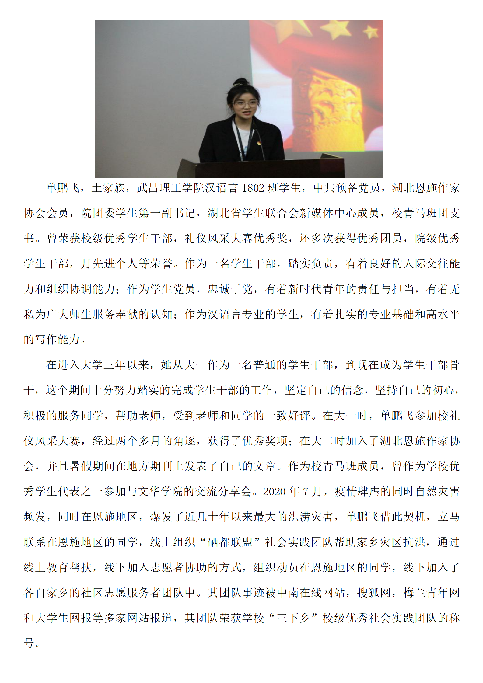 进入大学三年以来,她从大一作为一名普通的学生干部,到现在成为学生干部骨干,努力踏实的完成学生干部的工作,坚定自己的信念,坚持自己的初心,积极服务同学,受到老师和同学的一致好评。大一时,单鹏飞参加校礼仪风采大赛,经过两个多月的角逐,获得了优秀奖项;大二时加入了湖北恩施作家协会,并且暑假期间在地方期刊上发表了自己的文章。作为校青马班成员,曾作为学校优秀学生代表之一参加与文华学院的交流分享会。2020年7月,疫情肆虐的同时自然灾害频发,在恩施地区,爆发了近几十年以来最大的洪涝灾害,单鹏飞联系在恩施地区的同学,线上组织“硒都联盟”社会实践团队帮助家乡灾区抗洪,通过线上教育帮扶,线下加入志愿者协助的方式,组织动员在恩施地区的同学,加入各自家乡的社区志愿服务者团队。其团队事迹被中南在线网站,搜狐网,梅兰青年网和大学生网报等多家网站报道,其团队荣获学校“三下乡”校级优秀社会实践团队的称号。