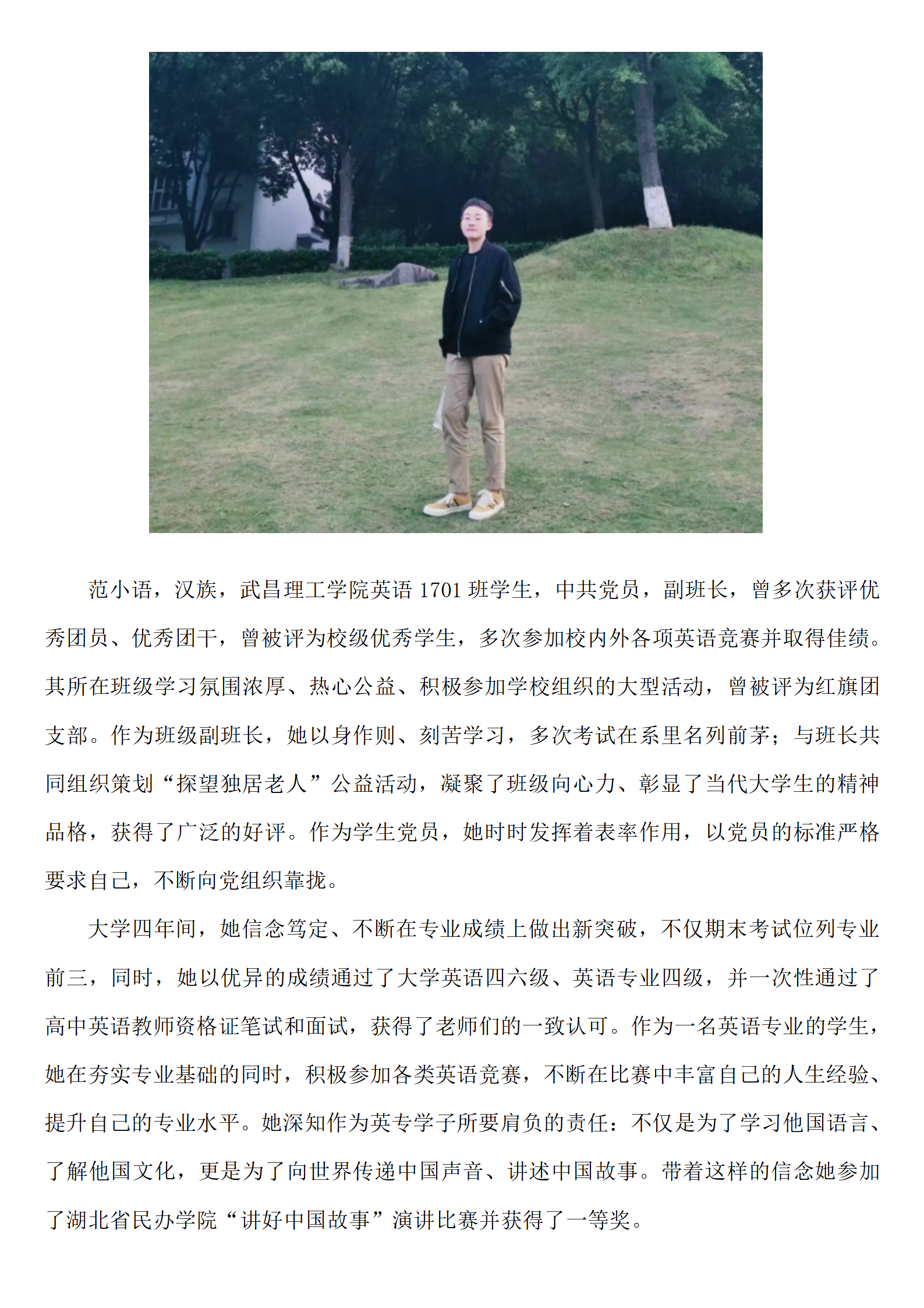 大学四年间,她信念笃定、不断在专业成绩上做出新突破,不仅期末考试位列专业前三,同时,她以优异的成绩通过了大学英语四六级、英语专业四级,并一次性通过了高中英语教师资格证笔试和面试,获得了老师们的一致认可。作为一名英语专业的学生,她在夯实专业基础的同时,积极参加各类英语竞赛,不断在比赛中丰富自己的人生经验、提升自己的专业水平。曾在外教社杯湖北省民办及独立学院英语演讲比赛中获得英语专业组一等奖、英语专业知识理论知识竞赛一等奖、外研社杯全国英语写作大赛一等奖、外研社杯全国英语阅读大赛二等奖、第26届湖北省翻译大赛决赛一等奖、希望之星英语风采大会成人组特等奖。她深知作为英专学子所要肩负的责任:不仅是为了学习他国语言、了解他国文化,更是为了向世界传递中国声音、讲述中国故事。带着这样的信念她参加了湖北省民办学院“讲好中国故事”演讲比赛并获得了一等奖。