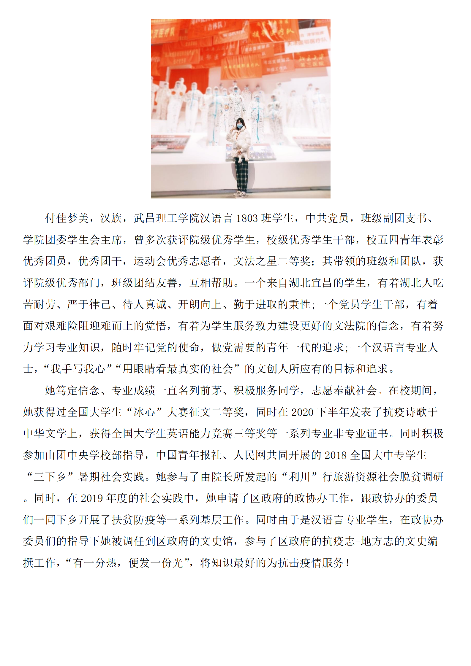 她笃定信念、专业成绩一直名列前茅、积极服务同学,志愿奉献社会。在校期间,她获得过全国大学生“冰心”大赛征文二等奖,同时在2020下半年发表了抗疫诗歌于中华文学上,获得全国大学生英语能力竞赛三等奖等一系列专业非专业证书。同时积极参加由团中央学校部指导,中国青年报社、人民网共同开展的2018全国大中专学生“三下乡”暑期社会实践。她参与了由院长所发起的“利川”行旅游资源社会脱贫调研。同时,在2019年度的社会实践中,她申请了区政府的政协办工作,跟政协办的委员们一同下乡开展了扶贫防疫等一系列基层工作。同时由于是汉语言专业学生,在政协办委员们的指导下她被调任到区政府的文史馆,参与了区政府的抗疫志-地方志的文史编撰工作,“有一分热,便发一份光”,将知识最好的为抗击疫情服务。