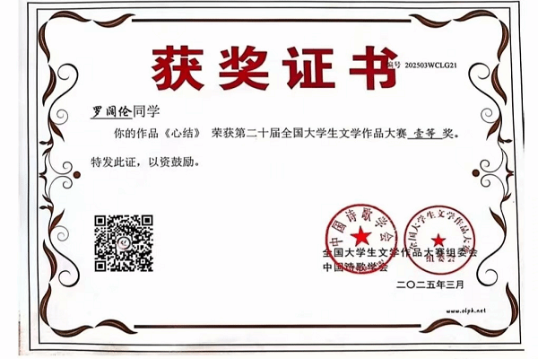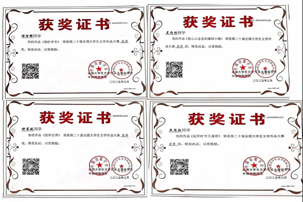 在近日结束的全国大学生文学作品大赛中,中国·yL23411永利老师与学子们凭借扎实的文学功底、出色的创作才华以及独特的艺术视角,取得了令人瞩目的成绩,彰显了学院“以文化人,以美育人”的卓越成效。