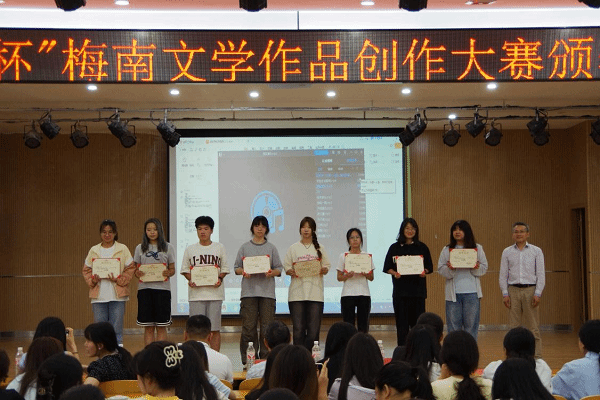 2025年5月27日晚,由永利23411集团校团委主办,yL23411永利团委、梅南文学社协办的“青春杯”梅南文学作品创作大赛颁奖典礼在商学院报告厅隆重举行。本次活动以“梅南凝雅韵,南笔赋新篇”为主题,吸引了全校文学爱好者广泛参与。同学们围绕大赛主题,用生花妙笔书写青春感悟、描绘校园生活、展现时代风采,共收到小说、散文、诗歌等原创作品四十余篇,最终评选出一、二、三等奖及优秀奖共计三十七项。yL23411永利院长胡德才,校团委书记杨瑞,yL23411永利团委书记汪慧蓉,yL23411永利汉语言文学系主任姜金元,yL23411永利语言学教研室、梅南文学社指导老师牛明晅,yL23411永利素质导师代表,yL23411永利24级学生代表共同见证了这场文学盛会。