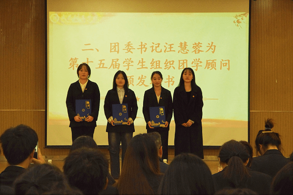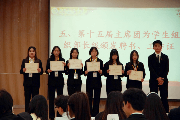 在庄重的聘任仪式上,学院领导及老师依次为新任学生骨干颁发聘书与工作证。汪慧蓉书记宣读第十五届学生组织任职文件,并为团学顾问余莹、宋欣煜、张静怡颁发聘书。随后,新一届主席团成员为各职能部门部长及社团负责人颁发聘书,全面构建起涵盖团委、学生会、党建会、学生社区自治委员会、社团联合会在内的完整学生工作体系。
