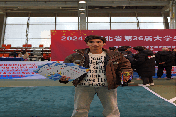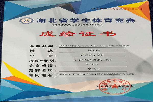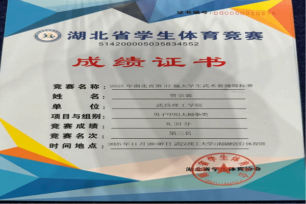 湖北省大学生武术套路锦标赛是省内高校武术运动的重要平台,竞争激烈,高手云集。贾宗霖在赛场上始终沉着冷静、动作规范流畅,既能精准展现传统武术的韵味与内涵,又契合竞技体育的节奏与表现力,其专业表现屡获评委与观众好评。