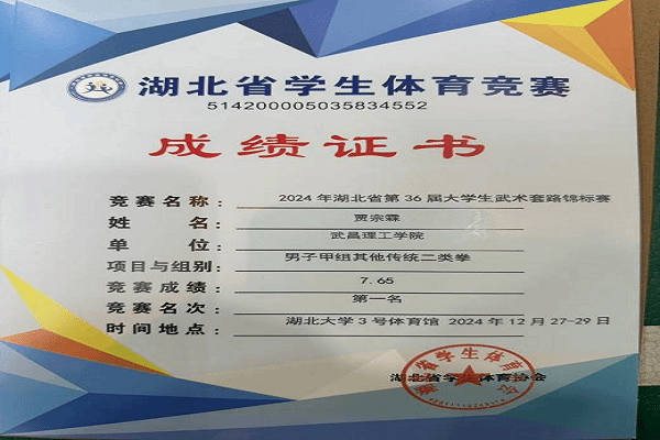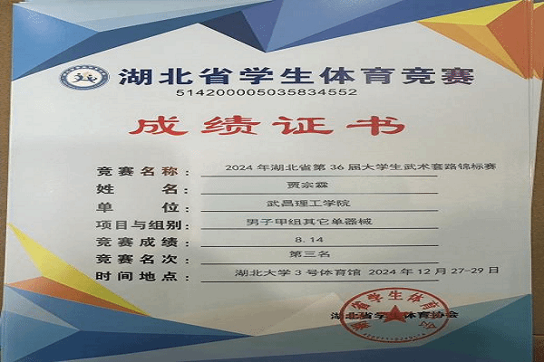 值得一提的是,贾宗霖在武术赛场上已是“常胜尖兵”。在2024年举行的湖北省第36届大学生武术套路锦标赛中,他就曾凭借出色表现,在“男子甲组其他传统二类拳”项目中以7.65分勇夺第一名,并在“男子甲组其他单器械”项目中以8.14分取得第三名的佳绩。连续两年在省级最高水平的大学生武术赛事中累计夺得金、银、铜牌各一枚,这不仅证明了其武术技能的全面性与稳定性,更彰显了他持之以恒、精益求精的训练态度。