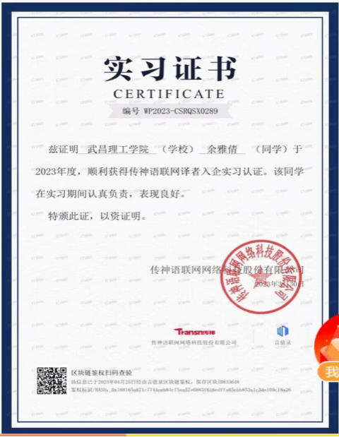 2024届毕业生有59名学生前往传神实习,完成了翻译技术与项目管理课程、字幕翻译入门认证等课程的学习,参加翻译实操培训,聆听专家老师的讲评答疑,获得了所学课程的结课证书和在传神的实习证书。